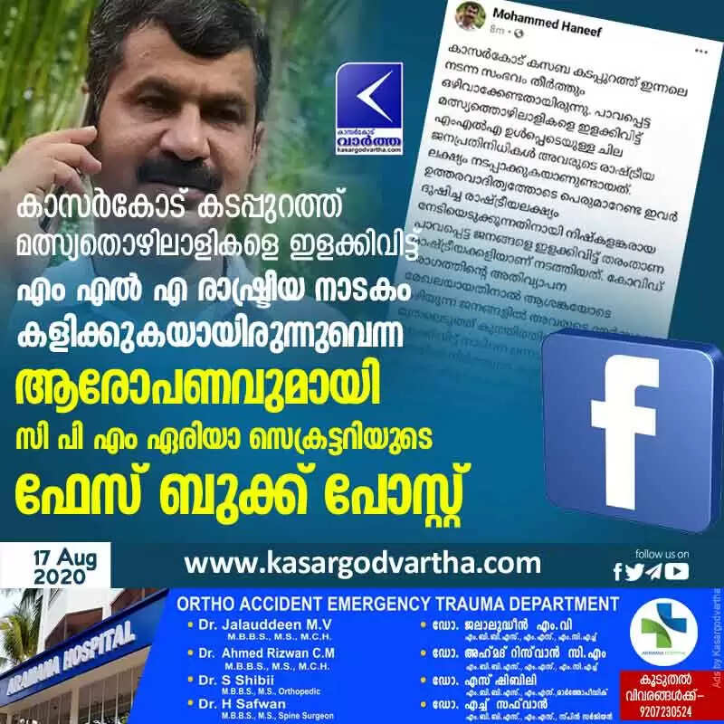 കാസർകോട് കടപ്പുറത്ത് മത്സ്യതൊഴിലാളികളെ ഇളക്കിവിട്ട് എം എൽ എ രാഷ്ട്രീയ നാടകം കളിക്കുകയായിരുന്നുവെന്ന ആരോപണവുമായി സി പി എം ഏരിയാ സെക്രട്ടറിയുടെ ഫേസ് ബുക്ക് പോസ്റ്റ്