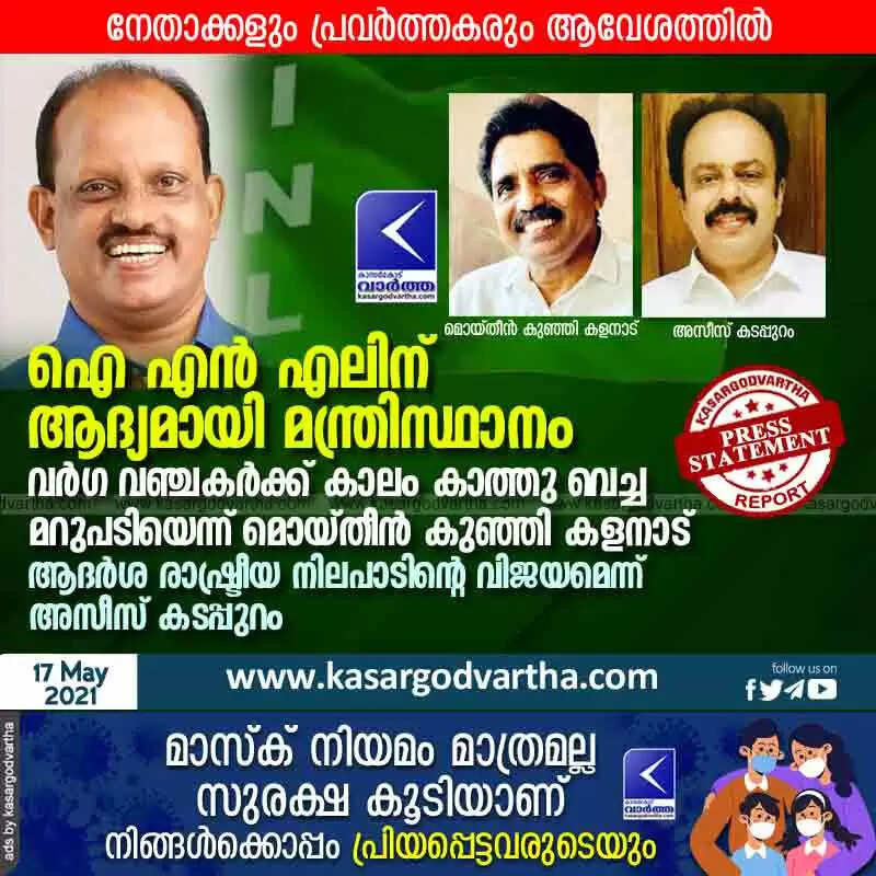ഐ എൻ എലിന് ആദ്യമായി മന്ത്രിസ്ഥാനം; നേതാക്കളും പ്രവർത്തകരും ആവേശത്തിൽ; വർഗ വഞ്ചകർക്ക് കാലം കാത്തു വെച്ച മറുപടിയെന്ന് മൊയ്‌തീൻ കുഞ്ഞി കളനാട്; ആദർശ രാഷ്ട്രീയ നിലപാടിന്റെ വിജയമെന്ന് അസീസ് കടപ്പുറം