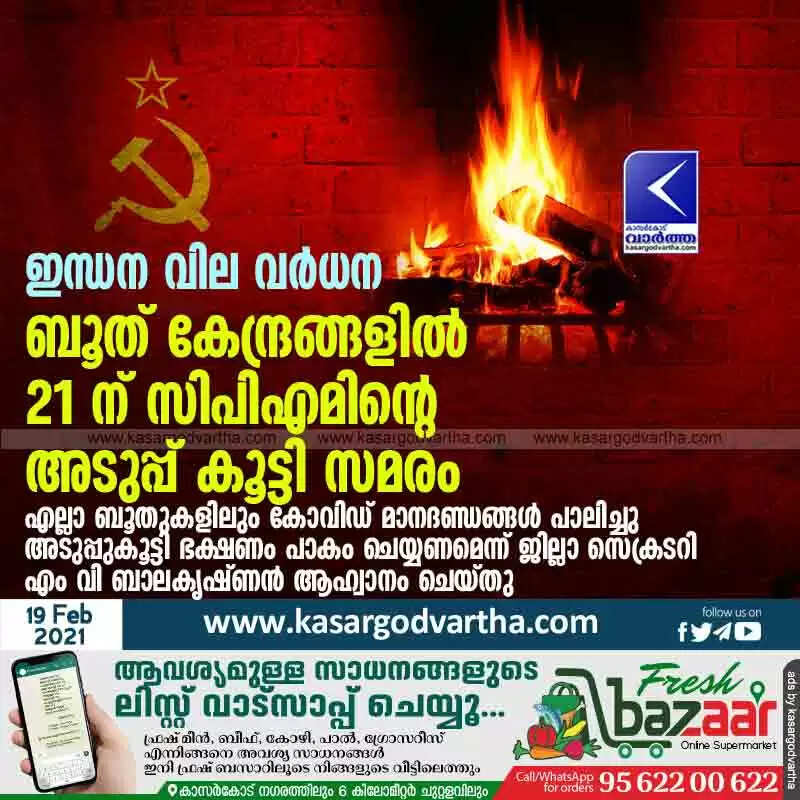 കാസർകോട്: (www.kasargodvartha.com 19.02.2021) പാചകവാതക, പെട്രോൾ, ഡീസൽ വില വർധനക്കെതിരെ ഫെബ്രുവരി 21 ന് ബൂത് കേന്ദ്രങ്ങളിൽ സിപിഎമിന്റെ അടുപ്പ് കൂട്ടി സമരം. എല്ലാ ബൂതുകളിലും കുടുംബങ്ങൾ ഒത്തുചേർന്നു കോവിഡ് മാനദണ്ഡങ്ങൾ പാലിച്ചു അടുപ്പുകൂട്ടി ഭക്ഷണം പാകം ചെയ്യണമെന്ന് സിപിഎം ജില്ലാ സെക്രടറി എം വി ബാലകൃഷ്ണൻ അഭ്യർഥിച്ചു.