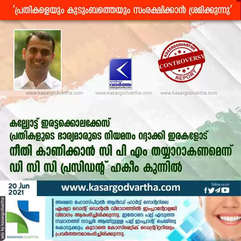 Keywords: Kasaragod, Kerala, News, Periya, Murder, Accuse, wife, Appointment, Hospital, District-Hospital, CPM, Congress, Political party, Politics, DCC, President, Hakeem Kunnil urges CPI (M) to cancel appointment of wives of accused in kalliot double murder case.
