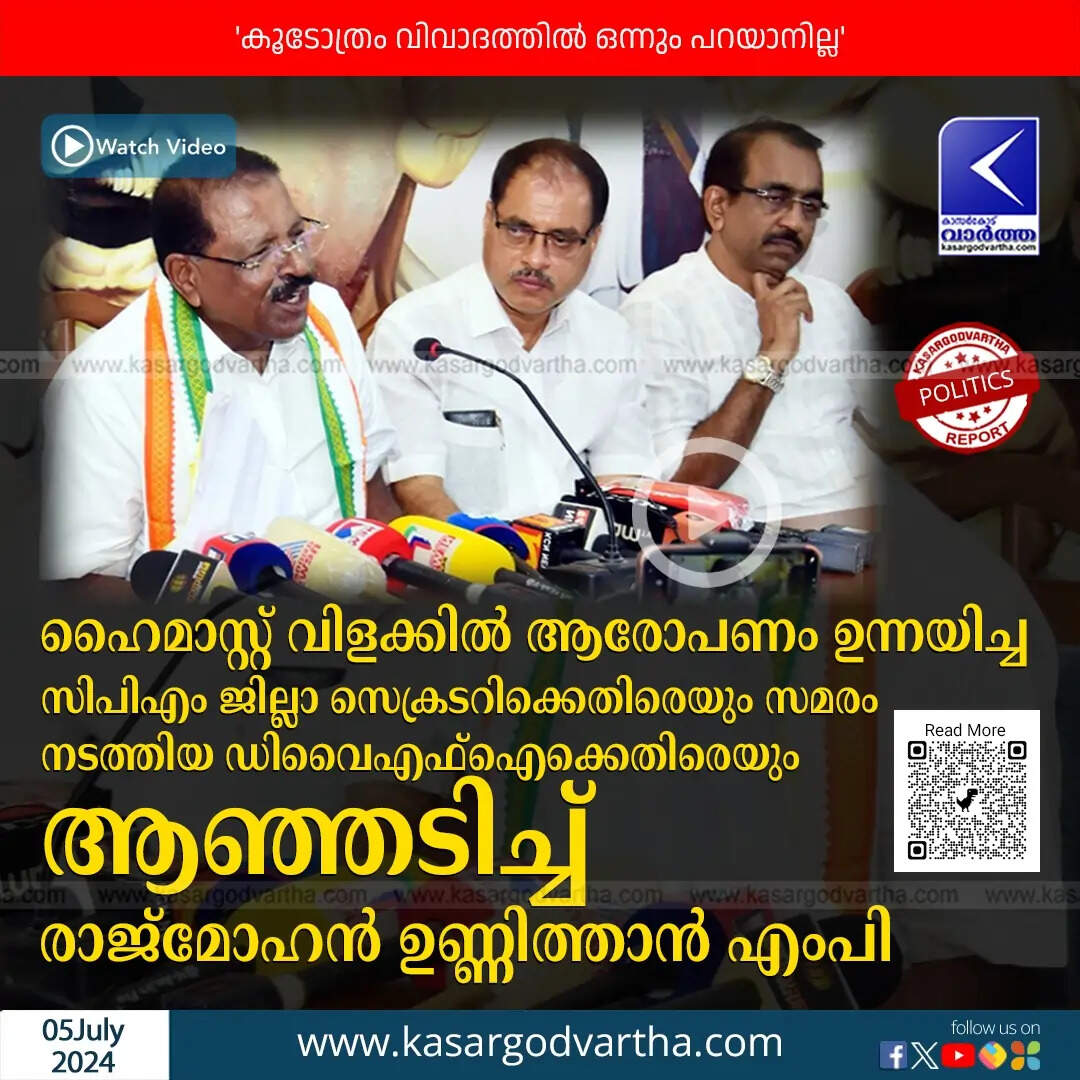 Rajmohan Unnithan | ഹൈമാസ്റ്റ് വിളക്കിൽ ആരോപണം ഉന്നയിച്ച സിപിഎം ജില്ലാ സെക്രടറിക്കെതിരെയും സമരം നടത്തിയ ഡിവൈഎഫ്ഐക്കെതിരെയും ആഞ്ഞടിച്ച് രാജ്മോഹൻ ഉണ്ണിത്താൻ എംപി