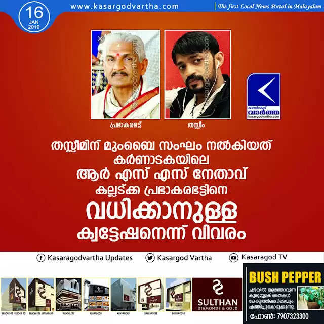 കാസര്‍കോട്: (www.kasargodvartha.com 16.01.2019) ചെമ്പിരിക്കയില്‍ 'സ്വയം ഡോണായി' പ്രഖ്യാപിച്ച തസ്ലീമിന് മുംബൈ കേന്ദ്രമാക്കിയുള്ള പാക്കിസ്ഥാന്‍ ബന്ധമുള്ള സംഘം നല്‍കിയ ക്വട്ടേഷന്‍ കര്‍ണാടകയിലെ പ്രമുഖ ആര്‍ എസ് എസ് നേതാവ് കല്ലട്ക്ക പ്രഭാകരഭട്ടിനെ വധിക്കാനുള്ള ക്വട്ടേഷനെന്ന് വിവരം പുറത്ത് വന്നു.