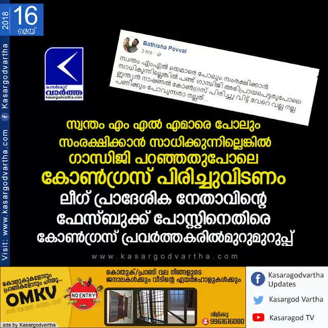 'സ്വന്തം എം എല് എമാരെ പോലും സംരക്ഷിക്കാന് സാധിക്കുന്നില്ലെങ്കില് പണ്ട് ഗാന്ധിജി അഭിപ്രായപെട്ടതുപോലെ ഇന്ത്യന് നാഷണല് കോണ്ഗ്രസ് പിരിച്ചു വിട്ട് വേറെ വല്ല നല്ല പണിക്കും പോവുന്നതാ നല്ലത്...' എന്നായിരുന്നു ബാത്തിഷ പൊവ്വലിന്റെ ഫേസ്ബുക്ക് പോസ്റ്റ്. പോസ്റ്റിനെതിരെ കോണ്ഗ്രസ് പ്രവര്ത്തകര് രംഗത്തുവന്നിട്ടുണ്ട്. മുന്നണി മര്യാദ പാലിക്കാതെയുള്ള പ്രതികരണത്തിന് കോണ്ഗ്രസ് പ്രവര്ത്തകര് മുതിര്ന്നാല് അത് ലീഗിന് താങ്ങാന് കഴിയില്ലെന്നാണ് മുളിയാറിലെ ഒരു പ്രാദേശിക കോണ്ഗ്രസ് നേതാവ് പ്രതികരിച്ചത്.