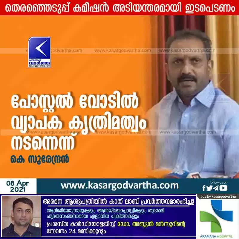 പോസ്റ്റല് വോടില് വ്യാപക കൃത്രിമത്വം നടന്നെന്ന് കെ സുരേന്ദ്രൻ