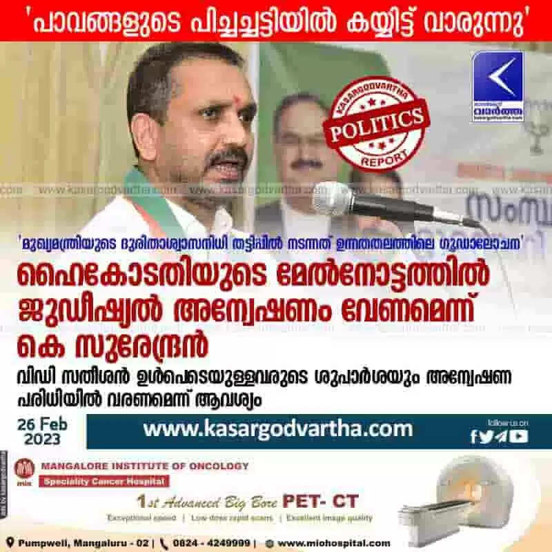 K Surendran | 'മുഖ്യമന്ത്രിയുടെ ദുരിതാശ്വാസനിധി തട്ടിപ്പില് നടന്നത് ഉന്നതതലത്തിലെ ഗൂഡാലോചന'; ഹൈകോടതിയുടെ മേല്നോട്ടത്തില് ജുഡീഷ്യല് അന്വേഷണം വേണമെന്ന് കെ സുരേന്ദ്രന്; വിഡി സതീശന് ഉള്പെടെയുള്ളവരുടെ ശുപാര്ശയും അന്വേഷണ പരിധിയില് വരണമെന്ന് ആവശ്യം