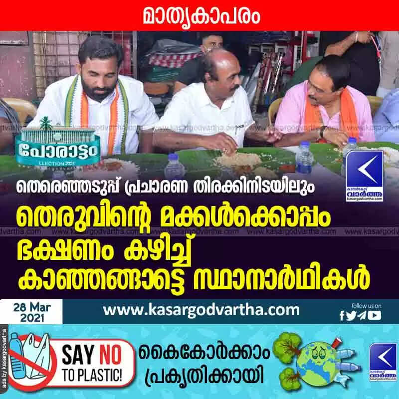 കാഞ്ഞങ്ങാട്: (www.kasargodvartha.com 28.03.2021) തെരെഞ്ഞടുപ്പ് പ്രചാരണ തിരക്കിനിടയിലും തെരുവിൻ്റെ മക്കൾക്കൊപ്പം ഭക്ഷണം കഴിച്ച് കാഞ്ഞങ്ങാട്ടെ സ്ഥാനാർഥികൾ.