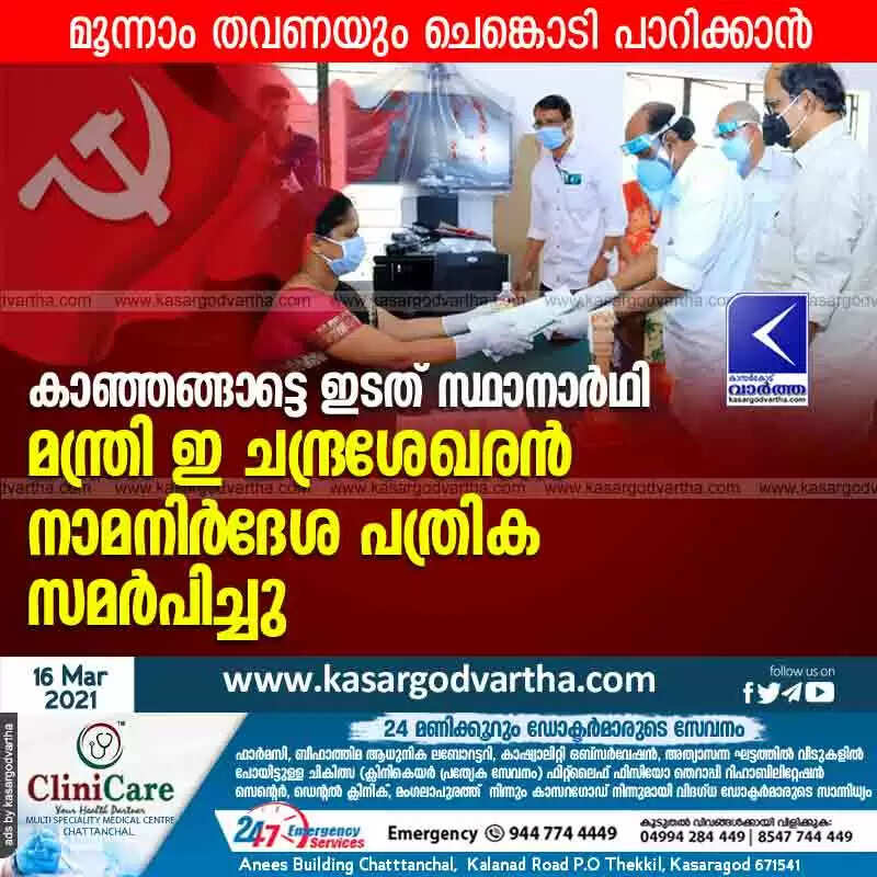 Keywords: Kerala, News, Kasaragod, Kanhangad, Top-Headlines, Politics, Political party, E.Chandrashekharan, Minister, Niyamasabha-Election-2021, Kanhangad Left candidate Minister E Chandrasekharan submitted his nomination papers.