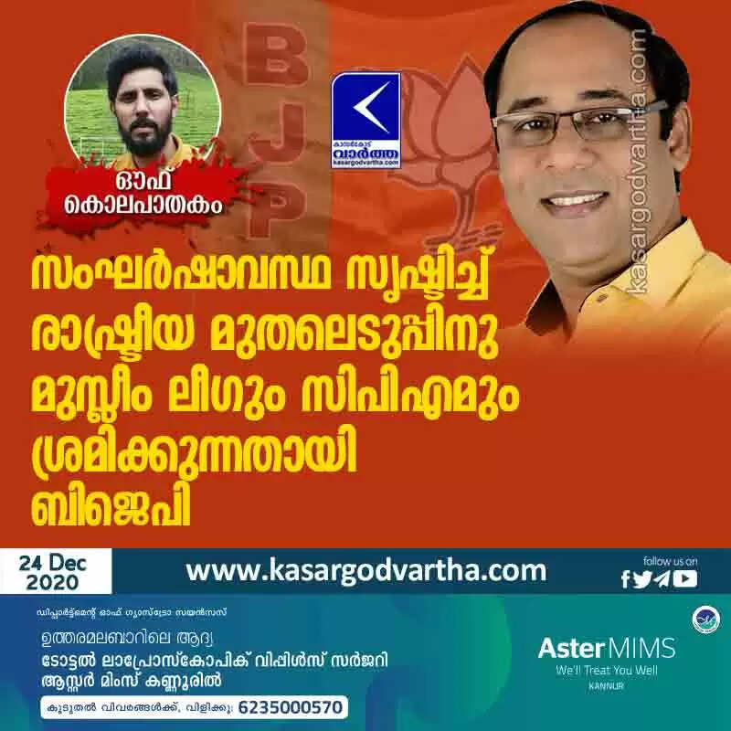 കാഞ്ഞങ്ങാട്ടെ കൊലപാതകം: സംഘർഷാവസ്ഥ സൃഷ്ടിച്ച് രാഷ്ട്രീയ മുതലെടുപ്പിനു മുസ്ലീം ലീഗും സിപിഎമും ശ്രമിക്കുന്നതായി ബിജെപി
