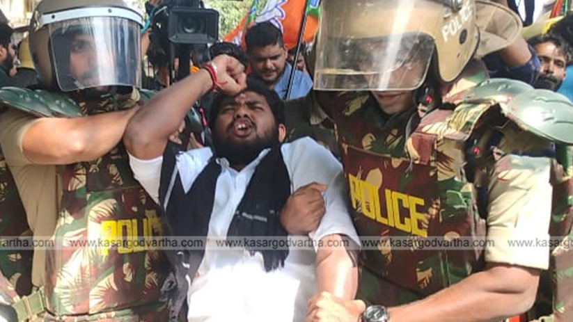 Article Summary: Yuva Morcha blocked Kasaragod Railway Station Road to protest its severe damage soon after tarring; police removed the workers.