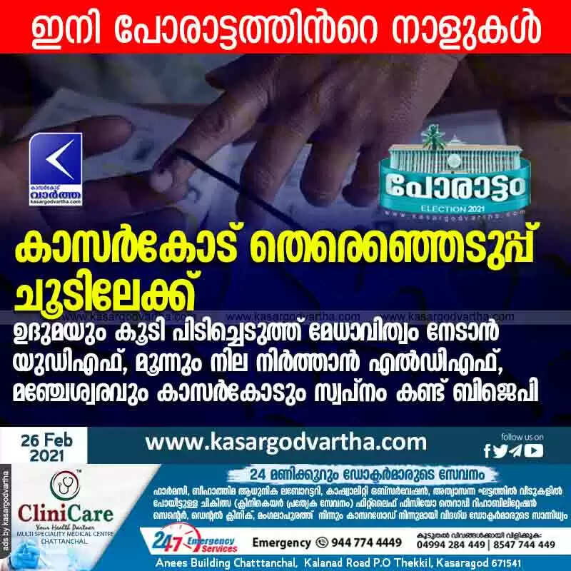 കാസർകോട്: (www.kasargodvartha.com 26.02.2021) തെരെഞ്ഞെടുപ്പ് തീയതി പ്രഖ്യാപിച്ചതോടെ ജില്ലയിൽ ശക്തമായ ത്രികോണ പോരാട്ടത്തിന് കളമൊരുങ്ങി.