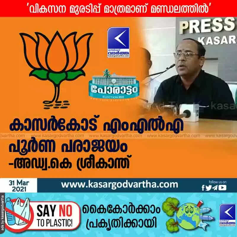 Keywords: Kerala, News, Kasaragod, Top-Headlines, Political party, Politics, Election, Niyamasabha-Election-2021, Press meet, Adv.Srikanth, BJP, Kasargod MLA complete defeat: Advocate K Srikanth.