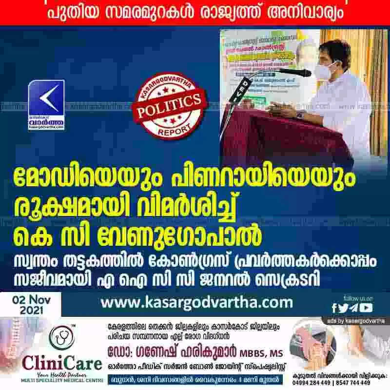 മോഡിയെയും പിണറായിയെയും രൂക്ഷമായി വിമർശിച്ച് കെ സി വേണുഗോപാൽ; 'പുതിയ സമരമുറകൾ രാജ്യത്ത് അനിവാര്യം'; സ്വന്തം തട്ടകത്തിൽ കോണ്ഗ്രസ് പ്രവർത്തകർക്കൊപ്പം സജീവമായി എ ഐ സി സി ജനറല് സെക്രടറി