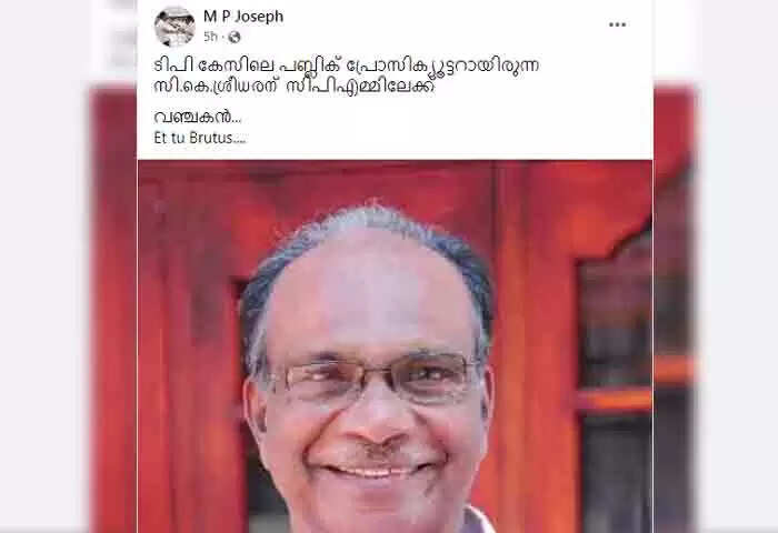 ടി പി കേസിലെ പബ്ലിക് പ്രോസിക്യൂടറായിരുന്ന സി കെ ശ്രീധരന് സിപിഎമിലേക്ക് എന്ന് വ്യക്തമാക്കിക്കൊണ്ട് ഷെക്സ്പിയറിന്റെ വിശ്വവിഖ്യാതമായ ജൂലിയസ് സീസര് എന്ന നാടകത്തിലെ പ്രശസ്തമായ എറ്റ് റ്റു ബ്രൂടസ് (Et tu, Brutus) എന്ന വാക്കുപയോഗിച്ചാണ് സി കെ ശ്രീധരനെ 'വഞ്ചകന്' എന്ന് വിശേഷിപ്പിച്ചത്. നിരവധി പേരാണ് എംപി ജോസഫിന്റെ ഈ പോസ്റ്റില് കമെന്റുമായി രംഗത്ത് വന്നിട്ടുള്ളത്.