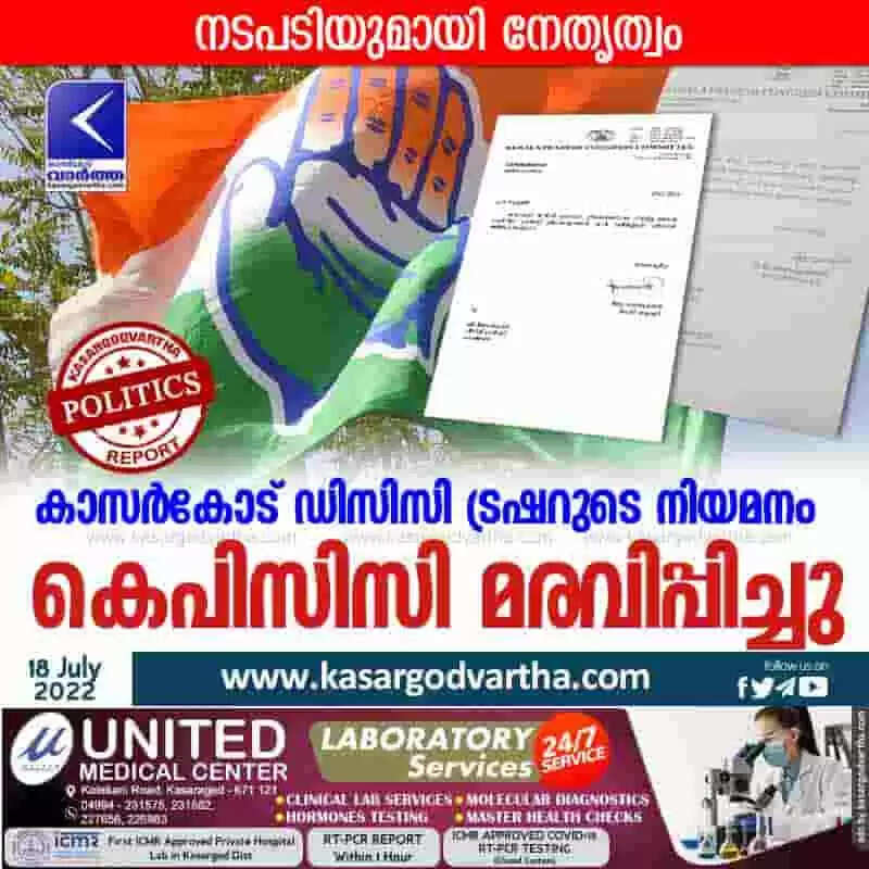 KPCC freezes | കാസര്‍കോട് ഡിസിസി ട്രഷറുടെ നിയമനം കെപിസിസി മരവിപ്പിച്ചു
