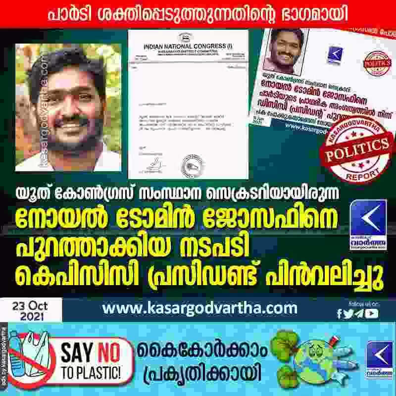 Keywords: Kerala, News, Kanhangad, Top-Headlines, Politics, Political party, Congress, Youth League, DCC, KPCC president withdrew action against Noel Tomin Joseph.