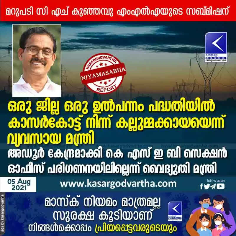 ഒരു ജില്ല ഒരു ഉൽപന്നം പദ്ധതിയിൽ കാസർകോട്ട് നിന്ന് കല്ലുമ്മക്കായയെന്ന് വ്യവസായ മന്ത്രി; അഡൂർ കേന്ദ്രമാക്കി കെ എസ് ഇ ബി സെക്ഷൻ ഓഫീസ് പരിഗണനയിലില്ലെന്ന് വൈദ്യുതി മന്ത്രി; മറുപടി സി എച് കുഞ്ഞമ്പു എംഎൽഎയുടെ സബ്മിഷന്
