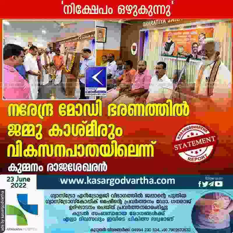 Keywords: Kasaragod, Kerala, News, Top-Headlines, BJP, Media Worker, Narendra-Modi, Prime Minister, Politics, Political Party, Endosulfan, Endosulfan-Victim, Visit, Yuvamorcha, Kummanam Rajasekharan says under Narendra Modi Jammu and Kashmir are on the path of development.