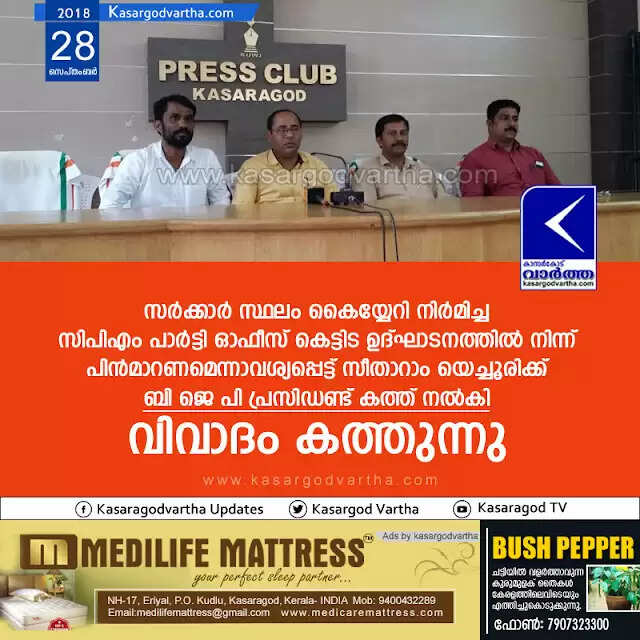 സര്ക്കാര് സ്ഥലം കൈയ്യേറി നിര്മിച്ച സിപിഎം പാര്ട്ടി ഓഫീസ് കെട്ടിട ഉദ്ഘാടനത്തില് നിന്ന് പിന്മാറണമെന്നാവശ്യപ്പെട്ട് സീതാറാം യെച്ചൂരിക്ക് ബി ജെ പി പ്രസിഡണ്ട് കത്ത് നല്കി; വിവാദം കത്തുന്നു