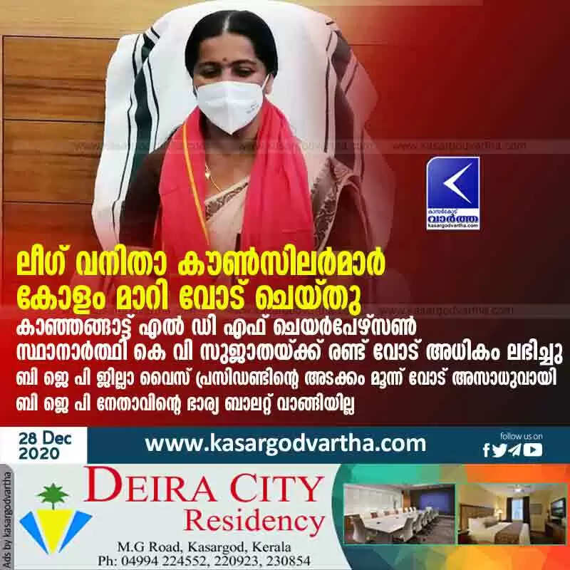 ലീഗ് വനിതാ കൗൺസിലർമാർ കോളം മാറി വോട് ചെയ്തു; കാഞ്ഞങ്ങാട്ട് എൽ ഡി എഫ് ചെയർപേഴ്സൺ സ്ഥാനാർത്ഥി കെ വി സുജാതയ്ക്ക് 2 വോട് അധികം ലഭിച്ചു; ബി ജെ പി ജില്ലാ വൈസ് പ്രസിഡണ്ടിൻ്റെ അടക്കം 3 വോട് അസാധുവായി; ബി ജെ പി നേതാവിൻ്റെ ഭാര്യ ബാലറ്റ് വാങ്ങിയില്ല