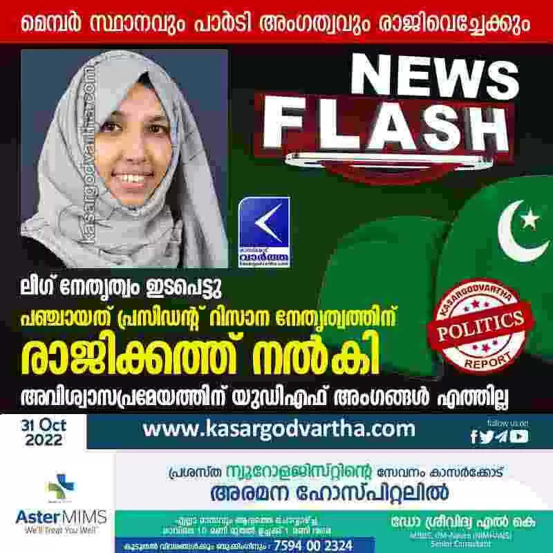 Resign | ലീഗ് നേതൃത്വം ഇടപ്പെട്ടു; മംഗൽപാടി പഞ്ചായത് പ്രസിഡന്റ് റിസാന നേതൃത്വത്തിന് രാജിക്കത്ത് നല്കി; അവിശ്വാസപ്രമേയത്തിന് യുഡിഎഫ് അംഗങ്ങള് എത്തില്ല