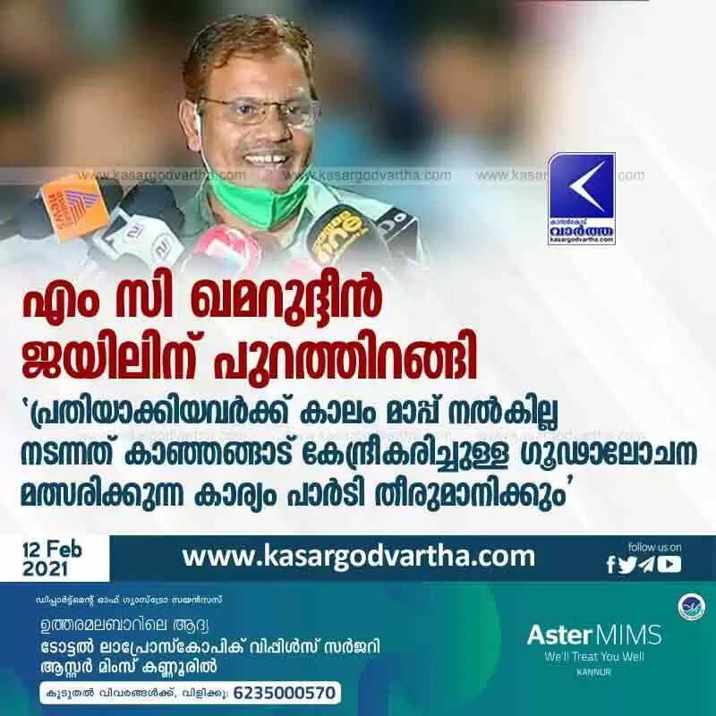 എം സി ഖമറുദ്ദീന് ജയിലിന് പുറത്തിറങ്ങി 'പ്രതിയാക്കിയവര്ക്ക് കാലം മാപ്പ് നല്കില്ല; നടന്നത് കാഞ്ഞങ്ങാട് കേന്ദ്രീകരിച്ചുള്ള ഗൂഢാലോചന; മത്സരിക്കുന്ന കാര്യം പാര്ടി തീരുമാനിക്കും'