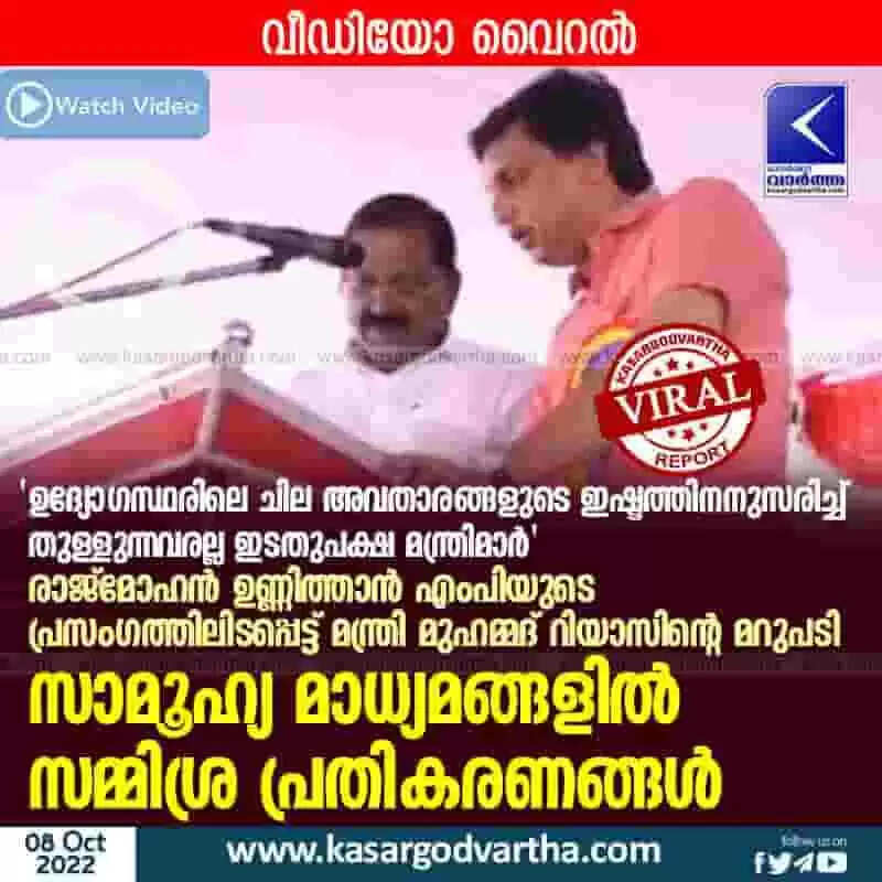 Keywords: Latest-News, Kerala, Kasaragod, Political-News, Politics, Rajmohan Unnithan, Viral-Video, Video, Social-Media, Minister Muhammad Riyas, Rajmohan Unnithan MP, Minister Muhammad Riyas's mass response to Rajmohan Unnithan MP's speech.