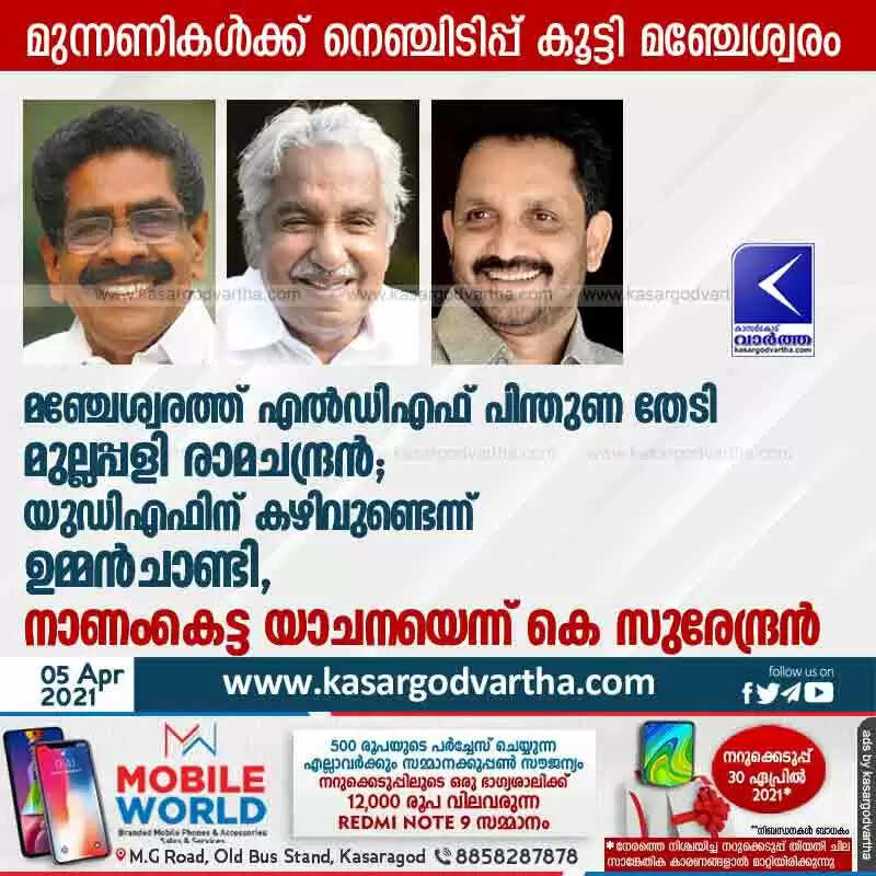 Keywords: Kasaragod, Kerala, News, Manjeshwaram, LDF, UDF, BJP, Oommen Chandy, K.Surendran, Politics, Niyamasabha-Election-2021, Top-Headlines, Mullappally Ramachandran seeks LDF support in Manjeswaram; Oommen Chandy said that the UDF has the ability and K Surendran said that it is a shameful.