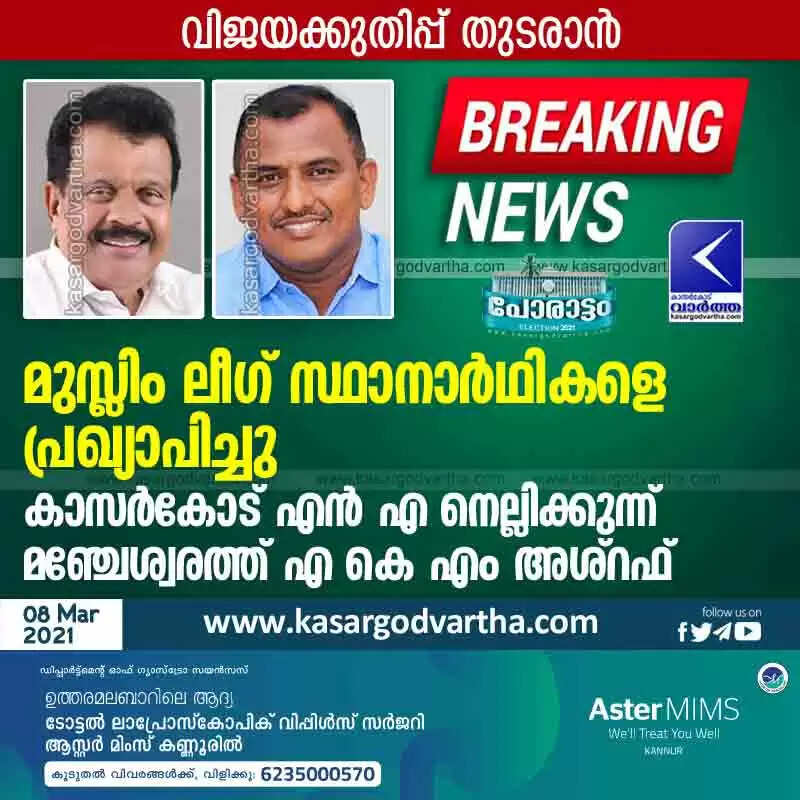 കാസർകോട്ട് എൻ എ നെല്ലിക്കുന്ന്; മഞ്ചേശ്വരം എ കെ എം അശ്‌റഫ്; മുസ്ലിം ലീഗ് നിയമസഭാ തിരഞ്ഞെടുപ്പിലേക്കുള്ള സ്ഥാനാർത്ഥികളെ പ്രഖ്യാപിച്ചു