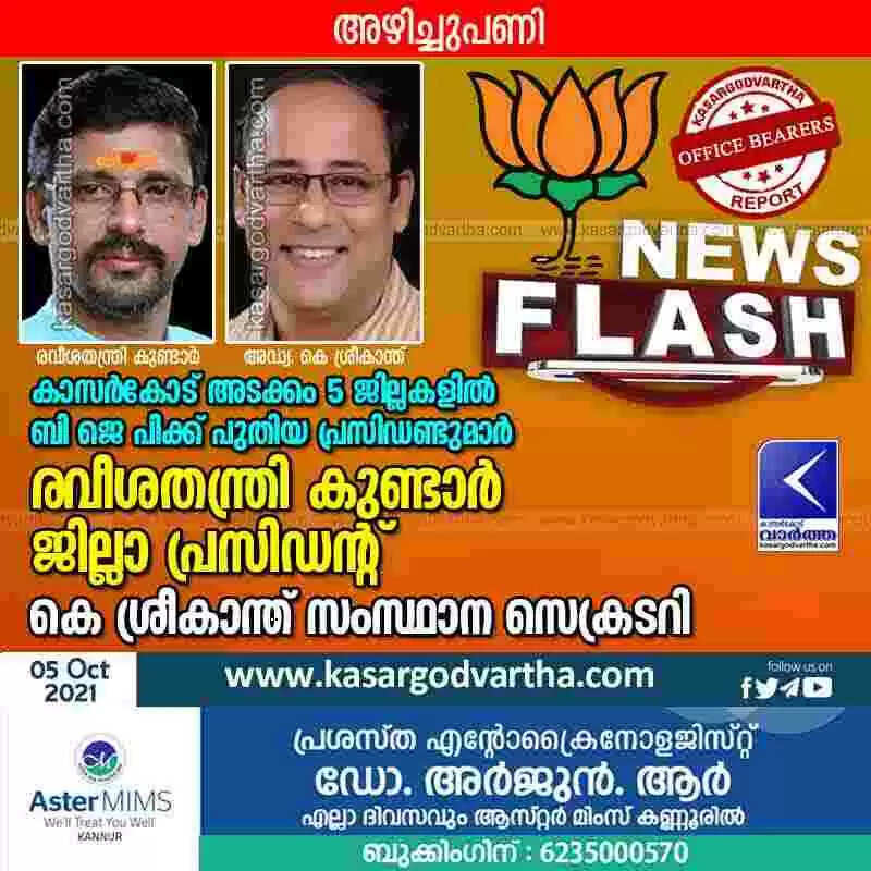 കാസർകോട് അടക്കം 5 ജില്ലകളിൽ ബി ജെ പിക്ക് പുതിയ പ്രസിഡണ്ടുമാർ; രവീശതന്ത്രി കുണ്ടാർ ജില്ലാ പ്രസിഡന്റ്, കെ ശ്രീകാന്ത് സംസ്ഥാന സെക്രടറി