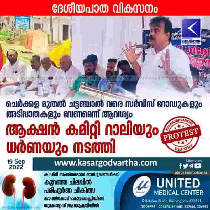 Protest | ദേശീയപാത വികസനം: ചെര്ക്കള മുതല് ചട്ടഞ്ചാല് വരെ സര്വീസ് റോഡുകളും അടിപ്പാതകളും വേണമെന്ന് ആവശ്യം; ആക്ഷന് കമിറ്റി റാലിയും ധര്ണയും നടത്തി