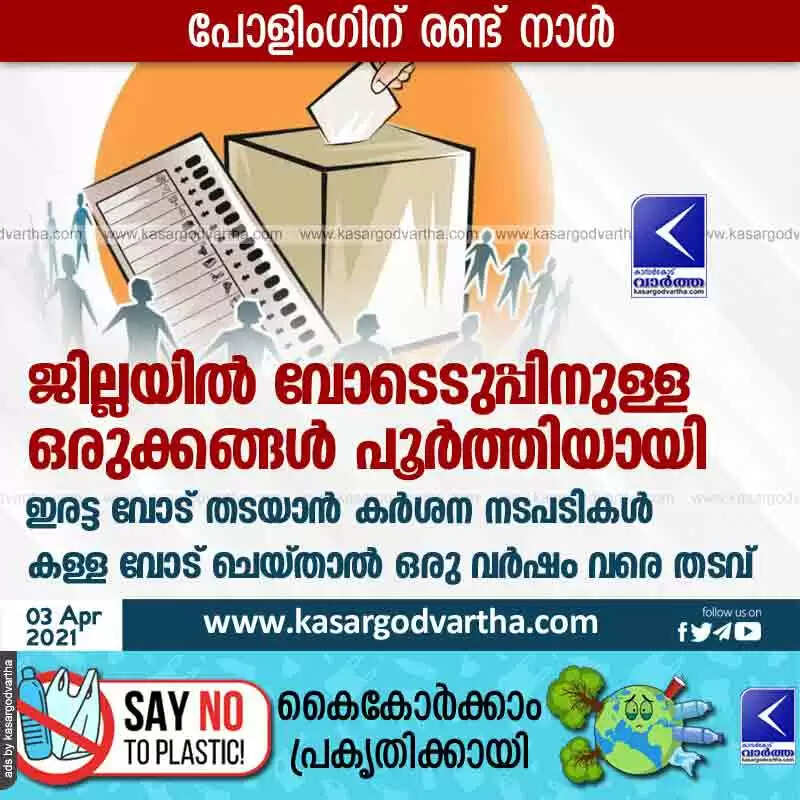 Keywords: Kasaragod, Kerala, News, Top-Headlines, Vote, Politics, Preparations for the polls in the district are complete; Strict measures to prevent double voting, imprisonment for up to one year for fraudulent voting.