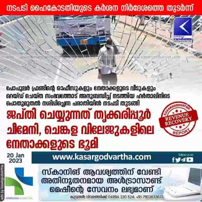 Revenue Recovery | പോപുലര് ഫ്രണ്ടിന്റെ ഓഫീസുകളും നേതാക്കളുടെ വീടുകളും റെയ്ഡ് ചെയ്ത സംഭവത്തോട് അനുബന്ധിച്ച് നടത്തിയ ഹര്താലിനിടെ പൊതുമുതല് നശിപ്പിച്ചെന്ന പരാതിയില് നടപടി തുടങ്ങി; ജപ്തി ചെയ്യുന്നത് തൃക്കരിപ്പൂര്, ചീമേനി, ചെങ്കള വിലേജുകളിലെ നേതാക്കളുടെ ഭൂമി