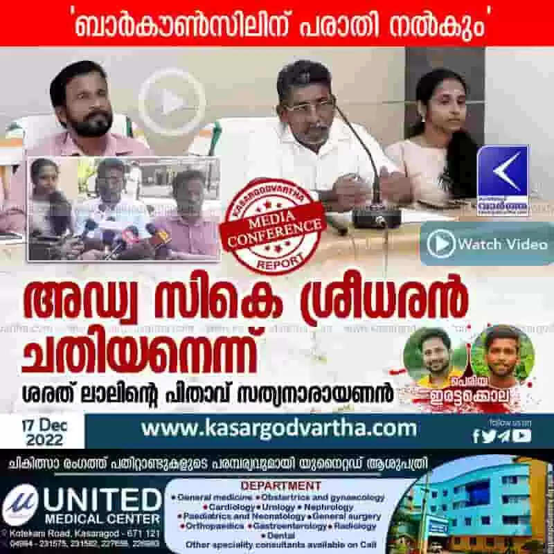 Keywords: Latest-News, Kerala, Kasaragod, Top-Headlines, Controversy, Political-News, Politics, Congress, CPM, Murder-Case, Court, CBI, Press Meet, Video, Sarath Lal's father Sathyanarayan called Adv CK Sreedharan a 'cheat'. < !- START disable copy paste -->