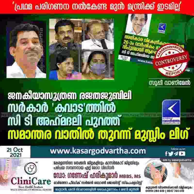 Keywords: Kerala, News, Kasaragod, Top-Headlines, Political party, Politics, Muslim-league, C.T Ahmmed Ali, K.Karunakaran, Silver Jubilee of Janakeeyasoothranam; former minister C T Ahammad Ali out in government programme.
