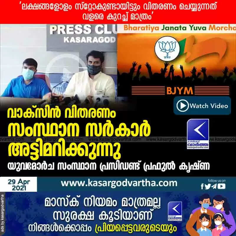 കാസർകോട്: (www.kasargodvartha.com 29.04.2021) കേന്ദ്ര സർക്കാർ നൽകുന്ന സൗജന്യ വാക്സിൻ വിതരണം കേരളത്തിൽ അട്ടിമറിക്കുകയാണെന്ന് യുവമോർച സംസ്ഥാന പ്രസിഡണ്ട് പ്രഫുൽ കൃഷ്ണവാർത്താ സമ്മേളനത്തിൽ കുറ്റപ്പെടുത്തി. ആവശ്യത്തിന് വാക്സിനുകൾ സ്റ്റോകുണ്ടായിട്ടും വിതരണം ചെയ്യാതെ കേരളം പൂഴ്ത്തിവെക്കുകയാണ് ഏപ്രിൽ. 27ന് 4,44,330 ഡോസ് വാക്സിൻ സ്റ്റോകുണ്ടായിട്ടും 28 ന് വിതരണം ചെയ്തത് 35,000 ത്തോളം വാക്സിൻ മാത്രമാണ്.