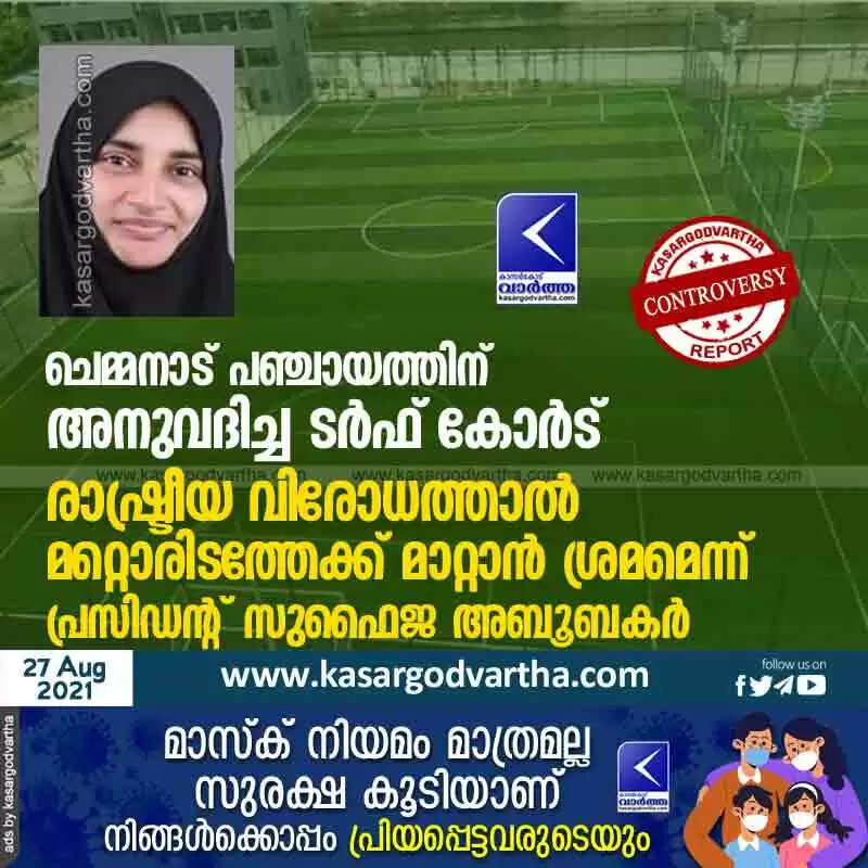 കോളിയടുക്കം: (www.kasargodvartha.com 27.08.2021) ഭൂമി വിട്ടുനൽകാൻ തയ്യാറായിട്ടും ചെമ്മനാട് പഞ്ചായത്തിന് അനുവദിച്ച ടർഫ് കോർട് രാഷ്ട്രീയ വിരോധം വെച്ച് മറ്റൊരിടത്തേക്ക് മാറ്റാൻ ശ്രമം നടക്കുന്നതായി പ്രസിഡന്റ് സുഫൈജ അബൂബകർ ആരോപിച്ചു.