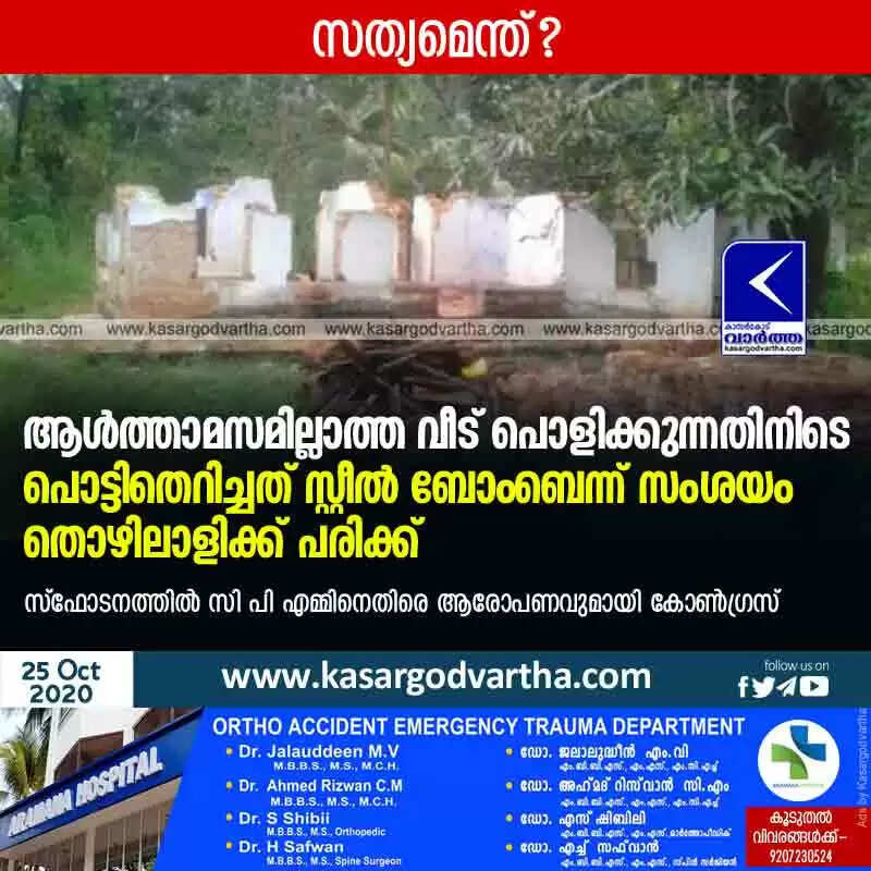 Keywords: Kerala, News, Kasaragod, Kanhangad, Pallikara, House, Injured, Politics, UDF, LDF, Yuvamorcha, Top-Headlines, Bomb, Police, Suspected steel bomb exploded during demolition of unoccupied house ; Worker injured.
