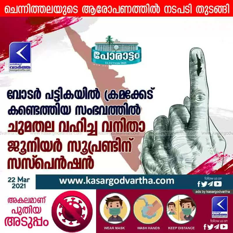 Keywords:  Kerala, News, Kasaragod, Top-Headlines, Political party, Politics, Election, Niyamasabha-Election-2021, Voters list, Vote, Suspension, Ramesh-Chennithala, Suspension of woman junior superintendent in charge of voter list irregularities.