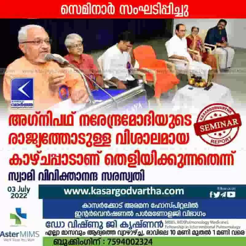 Keywords: News, Kerala, Kasaragod, Top-Headlines, BJP, Politics, Political Party, Narendra-Modi, Minister, Military, Army, Seminar, Programme, Adv. Srikanth, Swami Viviktananda Saraswati, Agnipath, Swami Viviktananda Saraswati says that the Agnipath program shows Narendra Modi's broad vision for the country.
