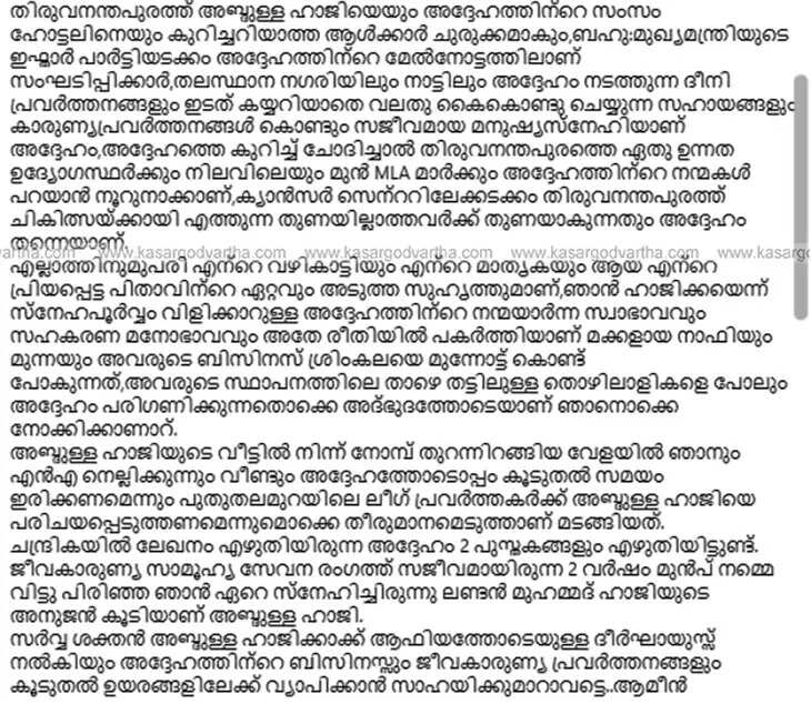 തിരുവനന്തപുരത്ത് അബ്ദുള്ള ഹാജിയെയും അദ്ദേഹത്തിന്റെ സംസം ഹോട്ടലിനെയും കുറിച്ചറിയാത്ത ആൾക്കാർ ചുരുക്കമാകും,ബഹു:മുഖ്യമന്ത്രിയുടെ ഇഫ്താർ പാർട്ടിയടക്കം അദ്ദേഹത്തിന്റെ മേൽനോട്ടത്തിലാണ് സംഘടിപ്പിക്കാർ,തലസ്ഥാന നഗരിയിലും നാട്ടിലും അദ്ദേഹം നടത്തുന്ന ദീനി പ്രവർത്തനങ്ങളും ഇടത് കയ്യറിയാതെ വലതു കൈകൊണ്ടു ചെയ്യുന്ന സഹായങ്ങളും കാരുണ്യപ്രവർത്തനങ്ങൾ കൊണ്ടും സജീവമായ മനുഷ്യസ്നേഹിയാണ് അദ്ദേഹം,അദ്ദേഹത്തെ കുറിച്ച് ചോദിച്ചാൽ തിരുവനന്തപുരത്തെ ഏതു ഉന്നത ഉദ്യോഗസ്ഥർക്കും നിലവിലെയും മുൻ MLA മാർക്കും അദ്ദേഹത്തിന്റെ നന്മകൾ പറയാൻ നൂറുനാക്കാണ്,ക്യാൻസർ സെന്ററിലേക്കടക്കം തിരുവനന്തപുരത്ത് ചികിത്സയ്ക്കായി എത്തുന്ന തുണയില്ലാത്തവർക്ക് തുണയാകുന്നതും അദ്ദേഹം തന്നെയാണ്.