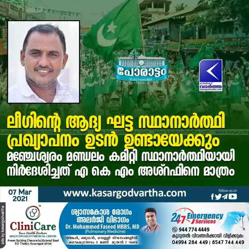 ലീഗിൻ്റെ ആദ്യ ഘട്ട സ്ഥാനാർത്ഥി പ്രഖ്യാപനം ഉടൻ ഉണ്ടായേക്കും; മഞ്ചേശ്വരം മണ്ഡലം കമിറ്റി സ്ഥാനാർത്ഥിയായി നിർദേശിച്ചത് എ കെ എം അശ്റഫിനെ മാത്രം