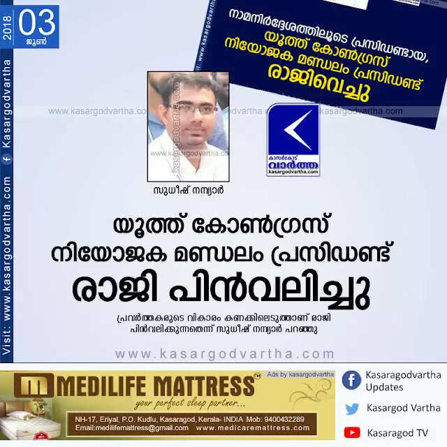 Keywords: Kasaragod, Kerala, news, president, youth-congress, Political party, Politics, Youth congress Constituency president cancel his resign