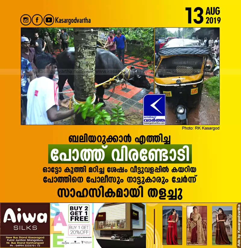 ബലിയറുക്കാന് എത്തിച്ച പോത്ത് വിരണ്ടോടി; ഓട്ടോ കുത്തി മറിച്ച ശേഷം വീട്ടുവളപ്പില് കയറിയ പോത്തിനെ പോലീസും നാട്ടുകാരും ചേര്ന്ന് സാഹസികമായി തളച്ചു