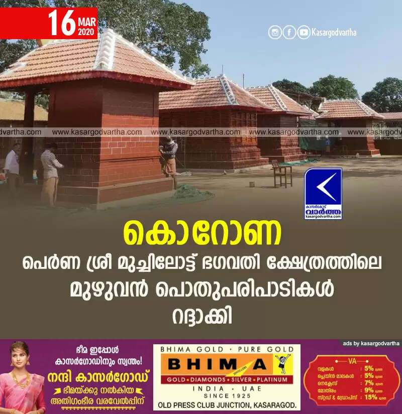 കൊറോണ: പെർണ ശ്രീ മുച്ചിലോട്ട് ഭഗവതി ക്ഷേത്രത്തിലെ മുഴുവൻ പൊതുപരിപാടികൾ റദ്ദാക്കി