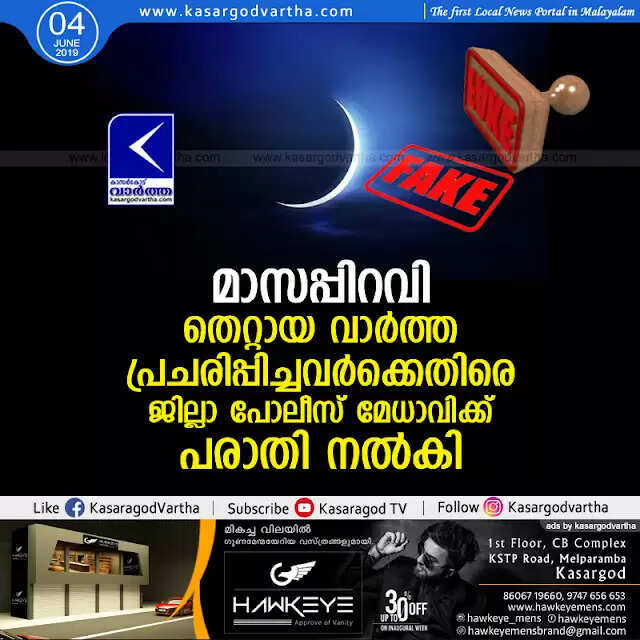മാസപ്പിറവി: തെറ്റായ വാര്ത്ത പ്രചരിപ്പിച്ചവര്ക്കെതിരെ ജില്ലാ പോലീസ് മേധാവിക്ക് പരാതി നല്കി