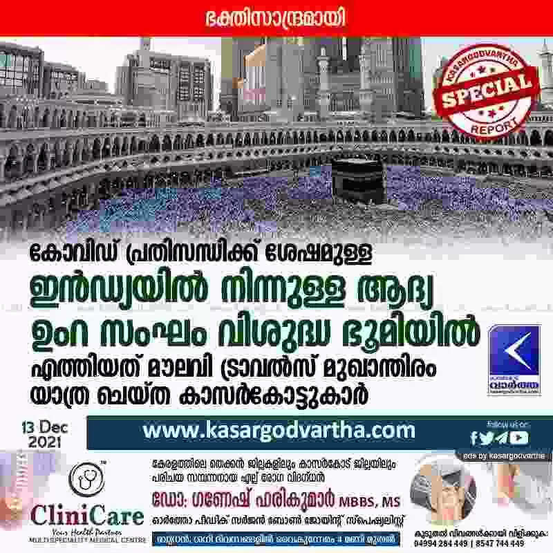 കോവിഡ് പ്രതിസന്ധിക്ക് ശേഷമുള്ള ഇൻഡ്യയിൽ നിന്നുള്ള ആദ്യ ഉംറ സംഘം വിശുദ്ധ ഭൂമിയിൽ; എത്തിയത് മൗലവി ട്രാവൽസ് മുഖാന്തിരം യാത്ര ചെയ്ത കാസർകോട്ടുകാർ