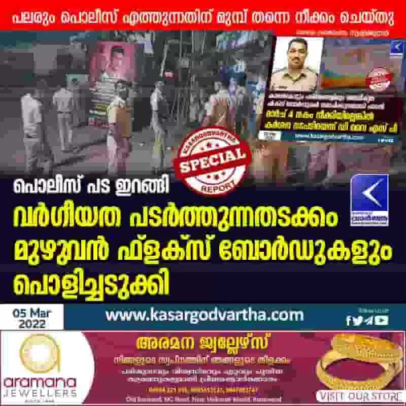 കാസർകോട്:(www.kasargodvartha.com 05.03.2022) പൊലീസ് പടയോടെ ഇറങ്ങി വർഗീയത പടർത്തുന്നതടക്കം കാസർകോട് നഗരത്തിലും പരിസരങ്ങളിലുമുള്ള മുഴുവൻ ഫ്ളക്സ് ബോർഡുകളും പൊളിച്ചടുക്കി.