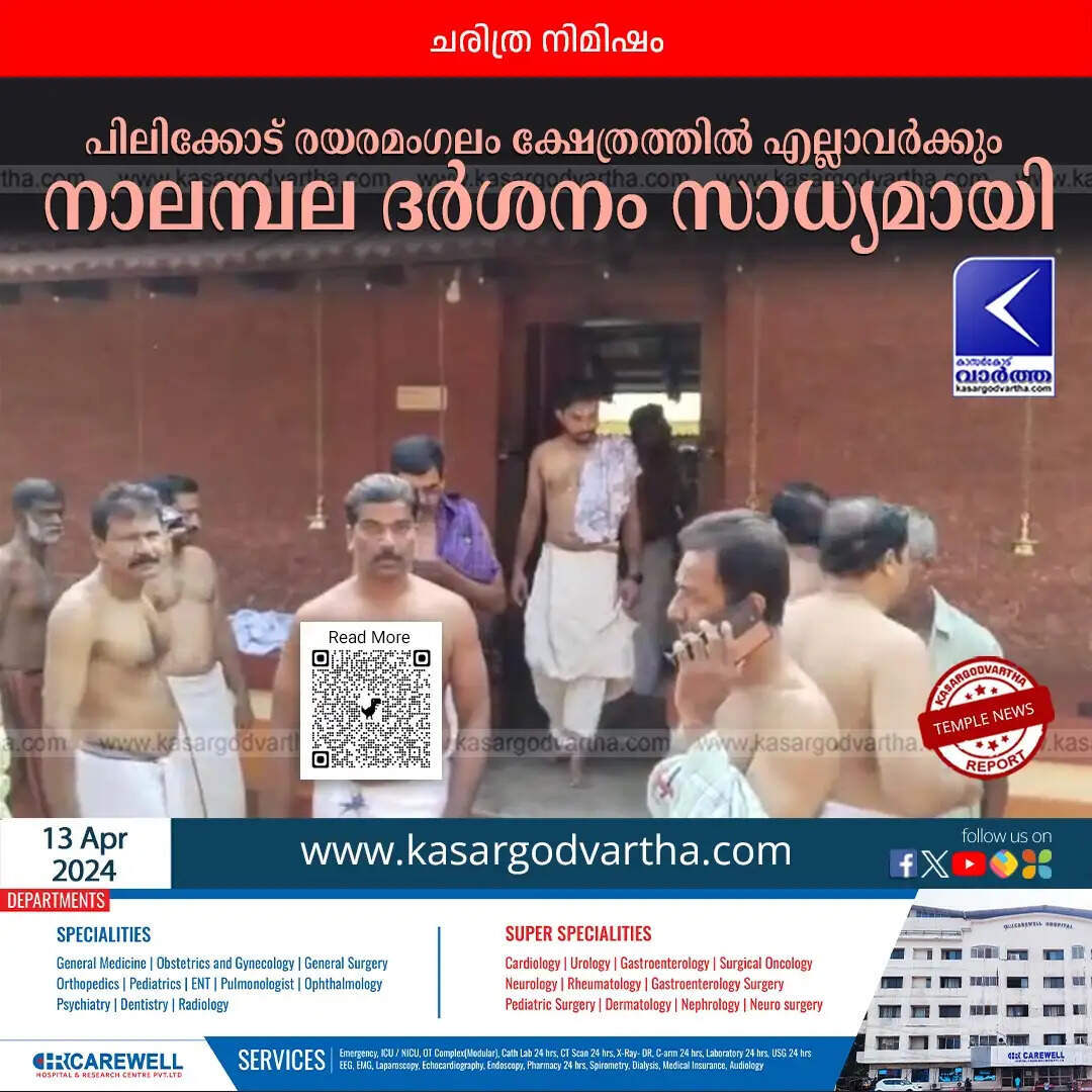 Temple News | ചരിത്ര നിമിഷം: പിലിക്കോട് രയരമംഗലം ക്ഷേത്രത്തിൽ എല്ലാവർക്കും നാലമ്പല ദർശനം സാധ്യമായി