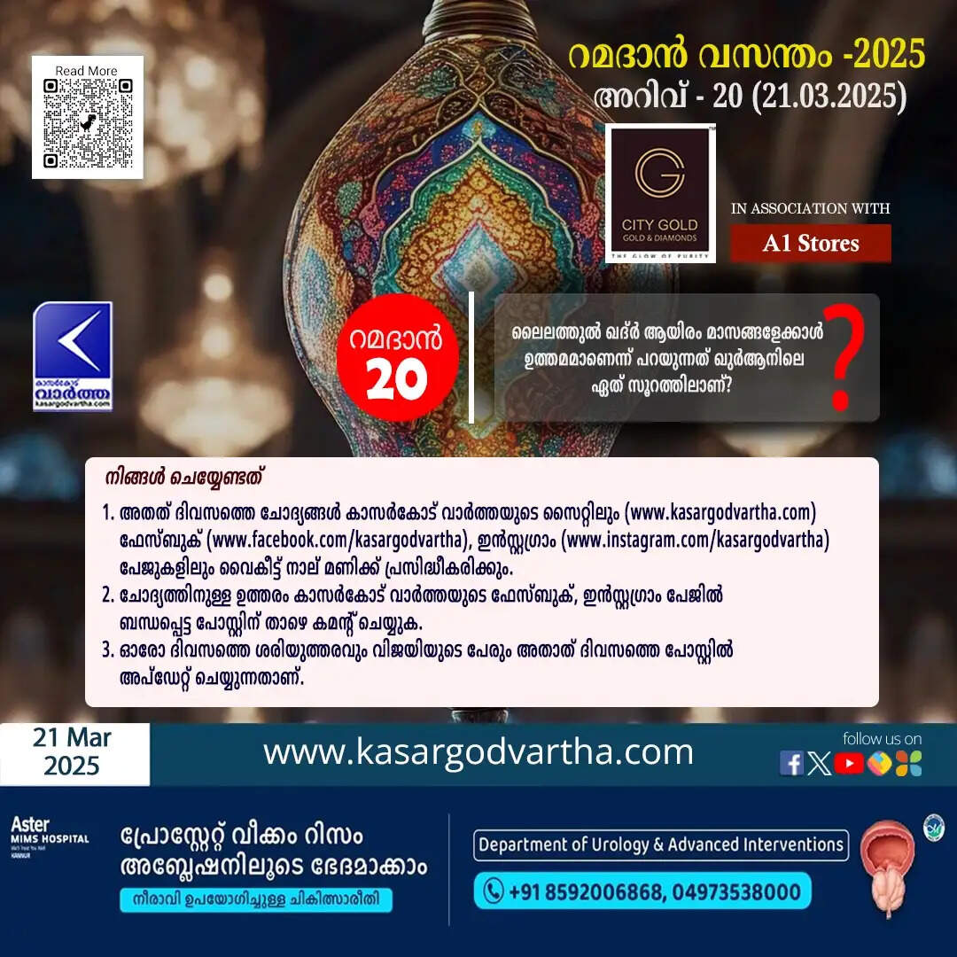 (KasargodVartha) അറിവ് - 20 (21.03.2025): ലൈലത്തുൽ ഖദ്ർ ആയിരം മാസങ്ങളേക്കാൾ ഉത്തമമാണെന്ന് പറയുന്നത് ഖുർആനിലെ ഏത് സൂറത്തിലാണ്?
