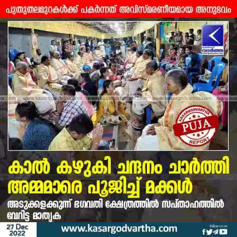 വെള്ളരിക്കുണ്ട്: (www.kasargodvartha.com) അടുക്കളക്കുന്ന് ഭഗവതി ക്ഷേത്രത്തില്‍ നടക്കുന്ന ഭാഗവത സപ്താഹസന്നിധിയില്‍ എത്തിയ അമ്മമാരെ കാല്‍ കഴുകി ചന്ദനം ചാര്‍ത്തി പൂവിട്ട് പൂജിച്ച് മക്കളും കൊച്ചു മക്കളും നടത്തിയ ചടങ്ങുകള്‍ മാതൃസ്‌നേഹത്തിന്റെ മാതൃകയായി മാറി. ഭാഗവത ആചാര്യന്‍ മാങ്കുളം ഗോവിന്ദന്‍ നമ്പൂതിരിയുടെ നേതൃത്വത്തില്‍ നടക്കുന്ന ഭാഗവത സപ്താഹസന്നിധിയിലാണ് മാതൃപൂജയുടെ ഭാഗമായി അമ്മമാരെ പൂജിച്ച് പാദത്തില്‍ നമസ്‌കരിക്കുന്ന ചടങ്ങ് നടന്നത്.